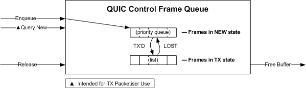 TX Packetiser queries the CFQ to determine what control frames it places in a packet. It does this before adding STREAM or CRYPTO frames (i.e., all CFQ frames are considered of higher priority). For each such frame it places in a packet, it:
